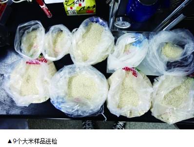 樣品來源:共9份樣品,7份是記者從4個(gè)小攤購買的樣品,還是兩份檢測工作人員自家購買的正食用的“新米”